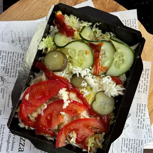 Сочное куриное филе, пекинский салат, свежие помидоры, маринованные огурчики, лук маринованный, картофель фри, фирменный чесночный соус,пшеничная лепешка.