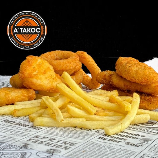 картофель фри 100 гр, луковые кольца 3шт, наггетсы 3шт, стрипсы 3 шт